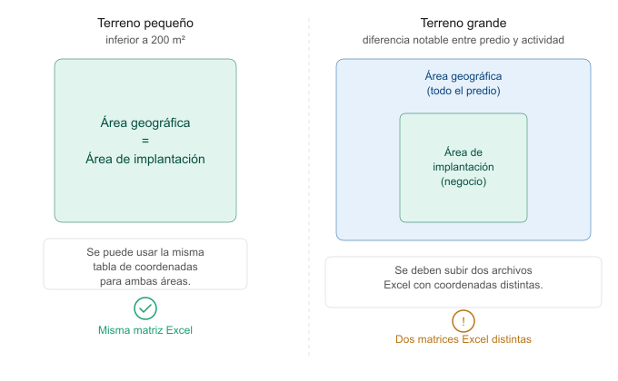 En cambio, cuando existe una diferencia notable entre el tamaño del terreno y la superficie donde realmente se desarrolla la actividad —situación frecuente en predios rurales o propiedades grandes— es necesario cargar dos archivos Excel con coordenadas distintas: uno para el polígono total del predio y otro para el área específica de operación.
